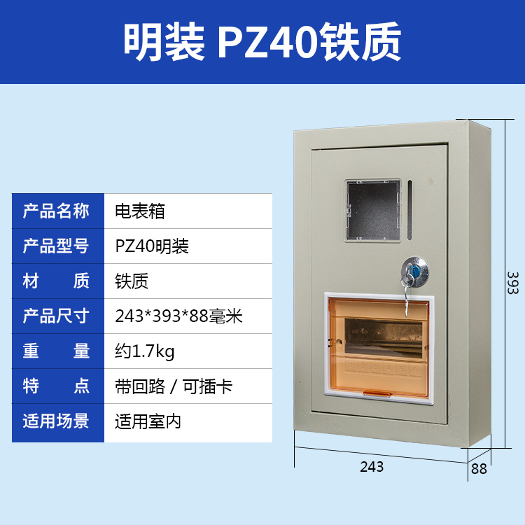 我公司生產的PZ40電表箱采用0.5-1mm厚冷軋鋼板和進口PC高透視窗,并帶有門鎖,安全防盜,大氣美觀。可安裝各類電能表和C45、空氣開關、斷路器閘刀等,廣泛用于家庭、公寓、學校、工廠等場所。